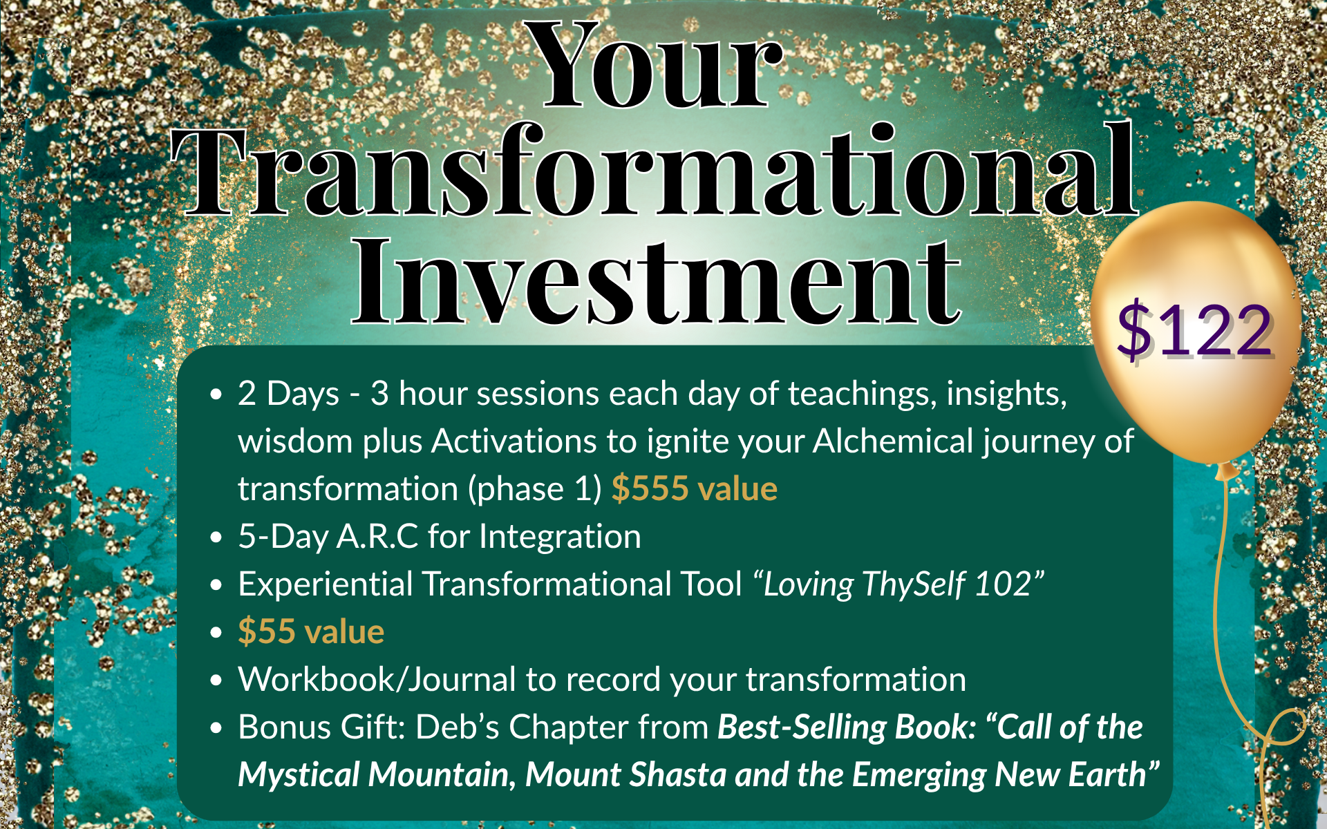 Then you'll have 5 days to be in the A.R.C. to integrate, do your homework, journey, work with the Experiential Transformational Tool "Loving ThySelf 102" that will begin to shift you from the inside out... AND you'll be observing yourself to see what "shakes loose" from the old paradigm!